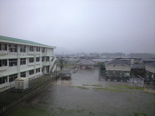 ←写真は我が家のベランダから撮った雨模様。左は小学校デス。
